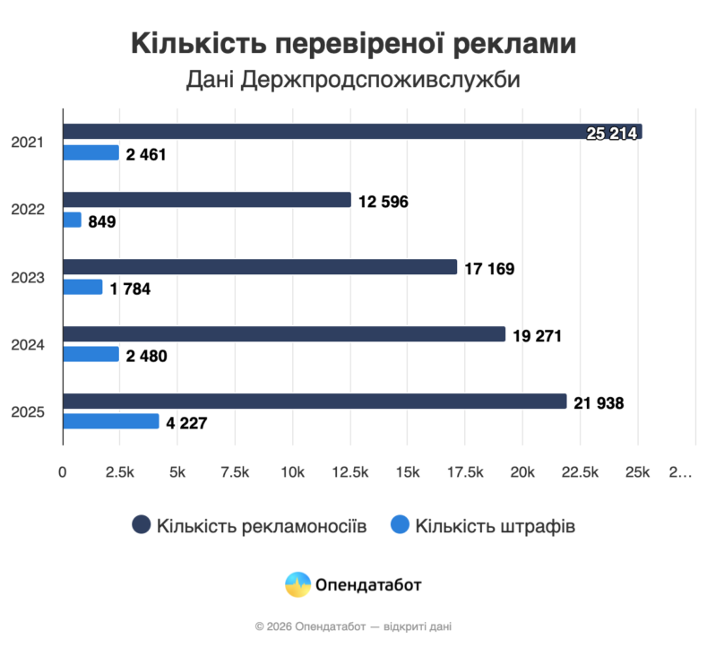 У 2025 році Держпродспоживслужба посилила контроль за дотриманням законодавства у сфері реклами. Протягом року служба провела 21 938 перевірок рекламоносіїв — це на 14% більше, ніж у 2024 році. Після різкого спаду у перший рік повномасштабної війни кількість перевірок зростає рік до року, хоча все ще не досягла рівня 2021 року.