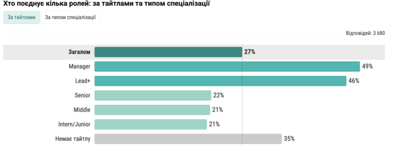 Найчастіше кілька ролей поєднують фахівці на керівних позиціях — General Leadership (CEO, COO) і Tech Leadership (CTO, Head of Engineering), а також працівники офіс-менеджменту: понад 60% з них суміщають основну роль з додатковою.