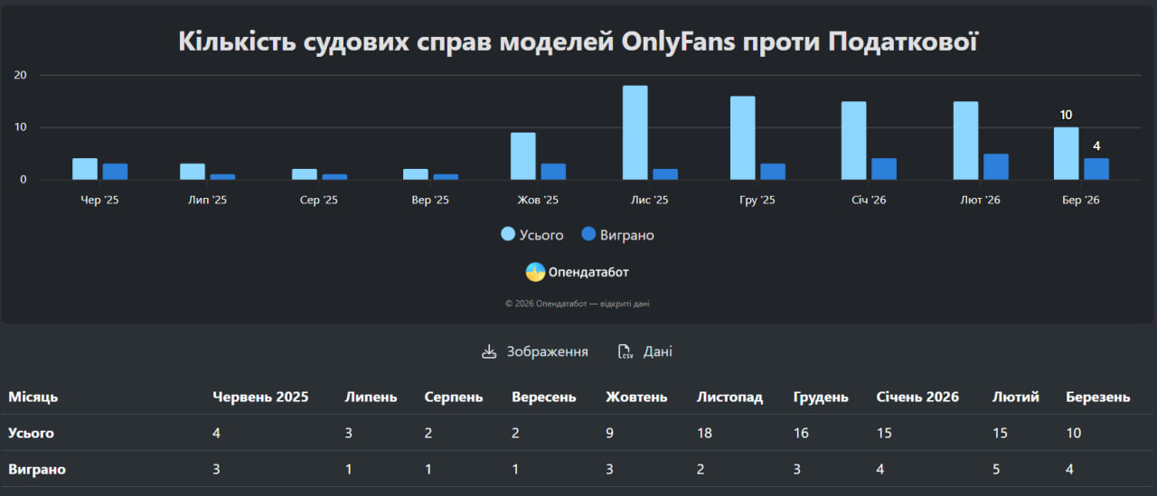 Моделі OnlyFans виграли щонайменше 27 судів проти Державної податкової служби — майже третину з 94 справ. Аналітику опублікував Opendatabot. Ми вибрали найголовніше.