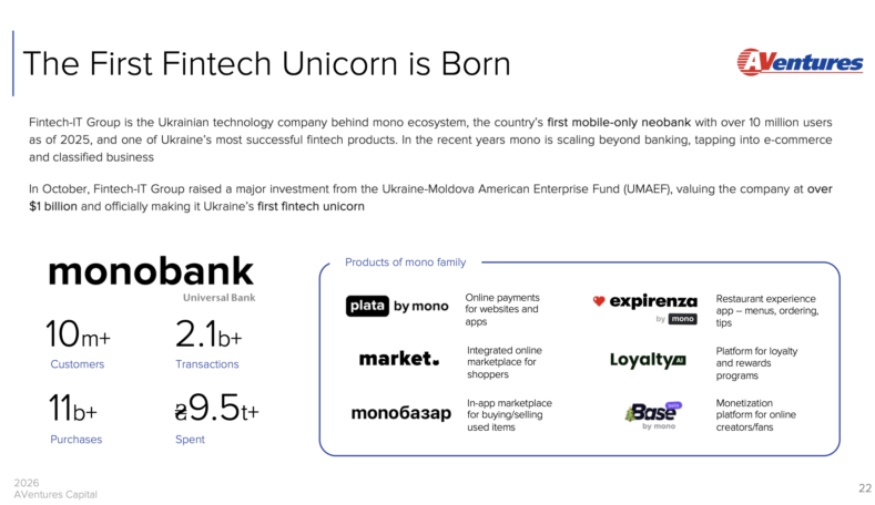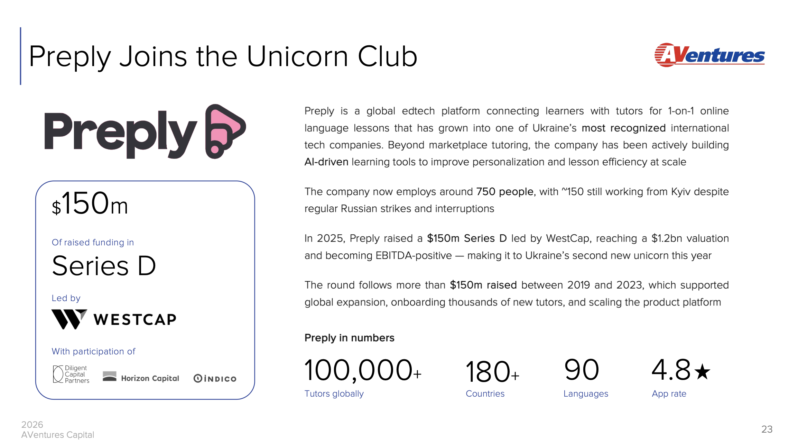 Одразу дві українські компанії отримали статус «єдинорогів» — Monobank та Preply. Крім того, Kyivstar провів IPO на NASDAQ, залучивши $178 млн при оцінці $2,3 млрд, що стало одним із найпотужніших сигналів міжнародної довіри до українського бізнесу за час повномасштабної війни.