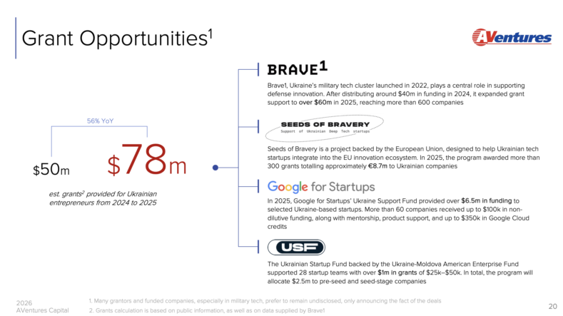 Паралельно зріс і обсяг грантової підтримки: за 2024–2025 роки він збільшився на 56%, до орієнтовних $78 млн, ключову роль у цьому відіграв кластер Brave1, який розподілив понад $60 млн лише у 2025 році.