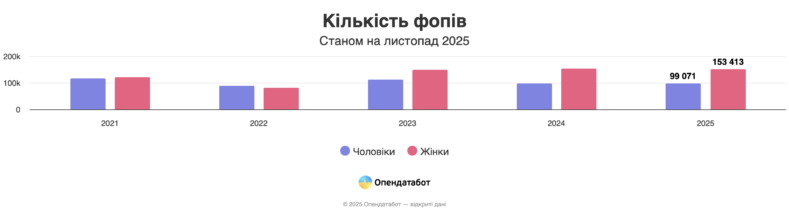 За даними Єдиного державного реєстру, жінки відкрили 153 413 нових ФОПів за перші 10 місяців 2025 року — це 61% від усіх новостворених бізнесів. Для порівняння, у 2021 році жінки відкрили 121 993 ФОПа, у 2022 році — 81 449, у 2023-му — 150 216, у 2024-му — 154 920.