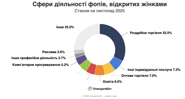Кожен третій новий жіночий бізнес працює у сфері роздрібної торгівлі — 49 700 ФОПів. Далі йдуть індивідуальні послуги — 11 100, гуртова торгівля — 10 700, освіта — 10 000, харчування — 8 800. У сфері індивідуальних послуг 88% нових підприємців — жінки, з яких 77% працюють у салонах краси, перукарнях та студіях догляду.