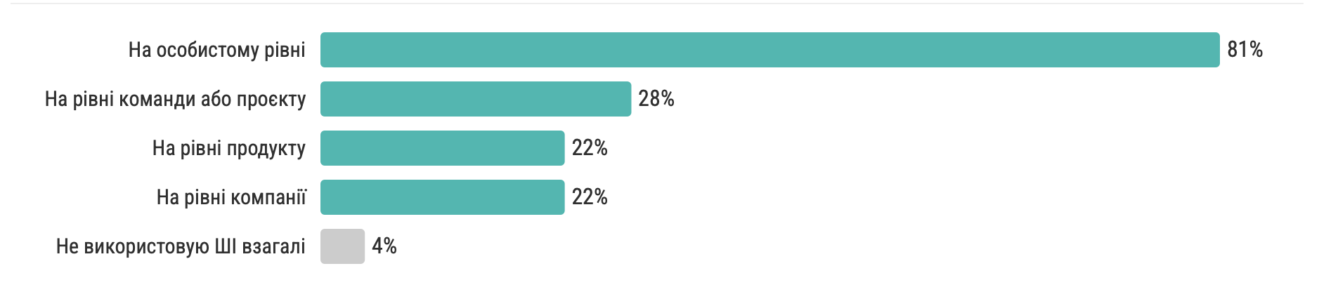 За результатами опитування, 81% айтівців використовує ШІ для особистих питань та робочих завдань, зокрема для написання коду, аналітики чи текстів. Тоді як у 28% він інтегрований у робочі процеси на рівні команди. 22% зазначили, що використовують ШІ як частину продукту чи на рівні всієї компанії. І тільки 4% ІТ-фахівців зовсім не використовують ШІ в роботі.