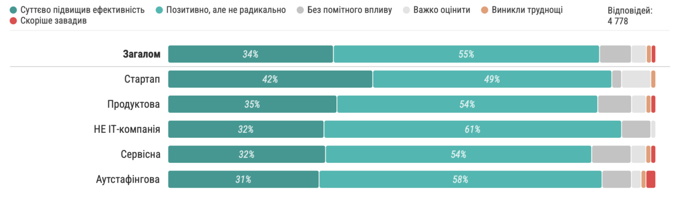 Найчастіше ШІ використовують у стартапах — 40%, у великих компаніях ШІ зазвичай використовують для організації процесів, тоді як для малих компаній реальний ефект від використання ШІ відчутний більше.