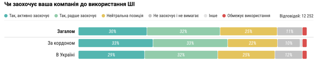 Великі компанії частіше стимулюють використовувати ШІ, а менші за розмірами компанії мають більш нейтральне ставлення.