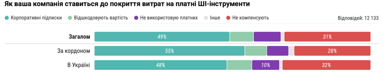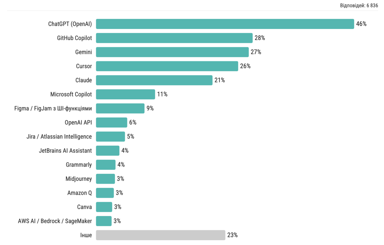 Найчастіше компанії оплачують ChatGPT, GitHub Copilot, Gemini, Cursor та Claude. Для розробників лідер — GitHub Copilot, для більшості інших спеціальностей — ChatGPT. У дизайні лідером є Figma AI.