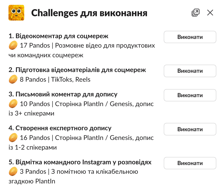 Перед запуском ми протестували систему на фокус-групі колег. Після старту додали в бот форму зворотного звʼязку для пропозицій і репорту багів. Після першого кварталу використання Pando ми провели опитування і виявили, що плантінівцям бракує інтуїтивності механіки. Тому розробили кастомне рішення — власний бот Pando для Slack, який обʼєднав всі функції системи. До цього ми використовували готовий бот для челенджів, що перестав відповідати нашим потребам.