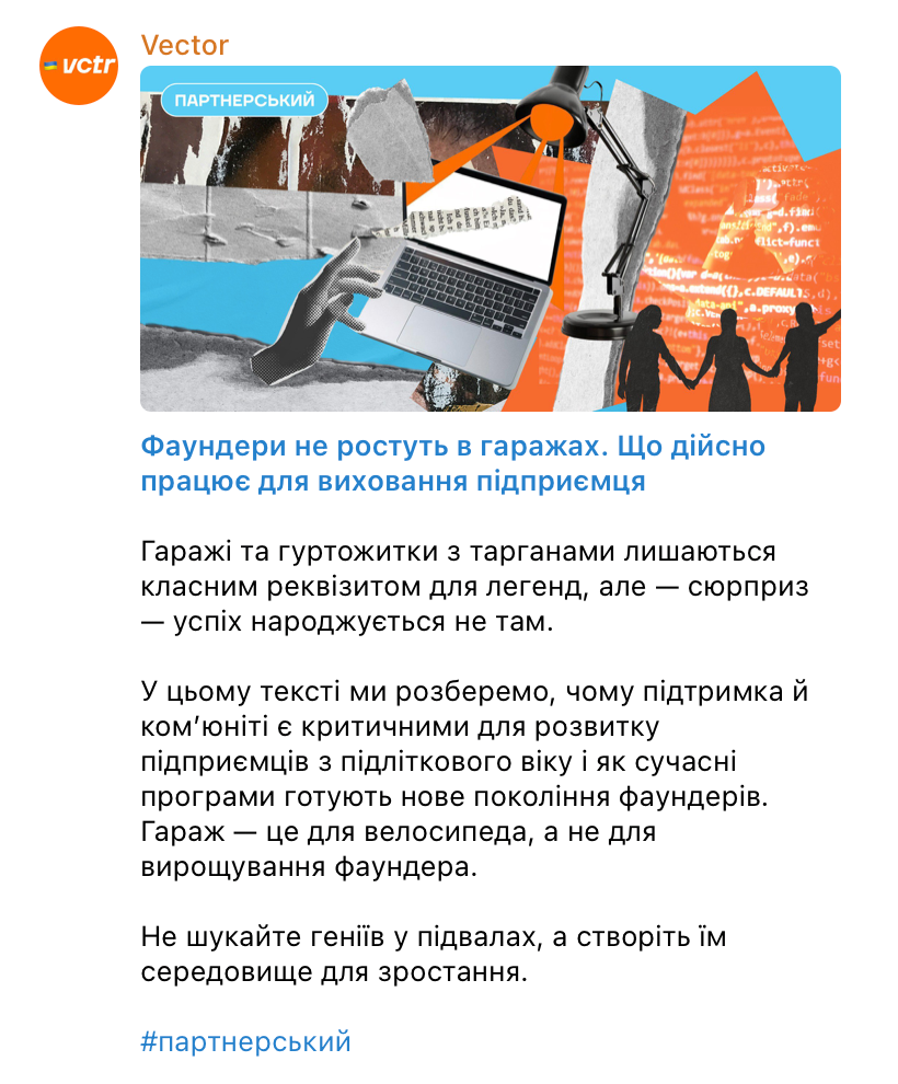 Матеріал «Фаундери не ростуть в гаражах. Що дійсно працює для виховання підприємця» — класичний приклад нативної реклами. Фіксуємо тенденцію та інтегруємо клієнта як рішення.