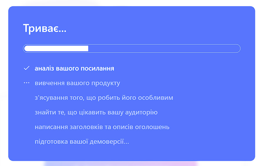 Наразі проєкт закрив першу задачу — автоматизоване генерування рекламних оголошень і креативів. Сервіс аналізує товар, аудиторію та pain points і за кілька кліків видає готові Google‑, Meta‑ чи Bing‑оголошення, зручні для A/B‑тестів і запуску кампаній. Майже готовий модуль для створення Facebook-реклами, команда працює над додаванням візуальних креативів, щоб надавати як текстові креативи, які вже мають підтверджене покращення CTR у ранніх користувачів, так і банери.