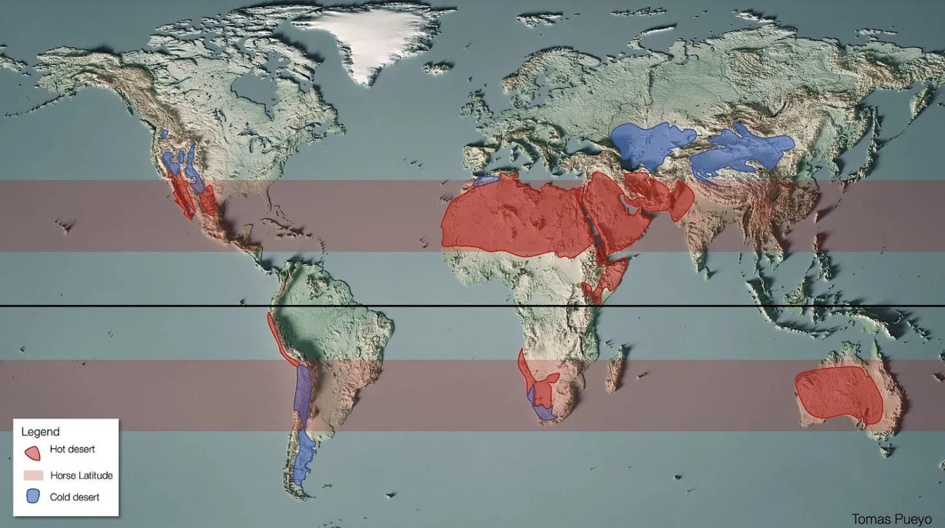 - Трохи далі від екватора розташовані так звані «кінські широти» — зони надзвичайної посухи, де сформувалися найбільші пустелі світу на всіх континентах.