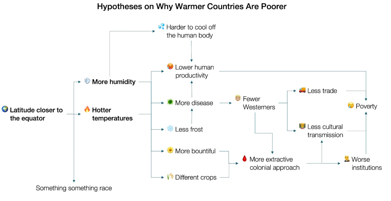Але навіть якщо температура справді пов’язана з рівнем недорозвиненості, постає запитання: який механізм цього зв’язку? Чи робить спека людей ледачішими? Чи, можливо, справа в чомусь іншому?
