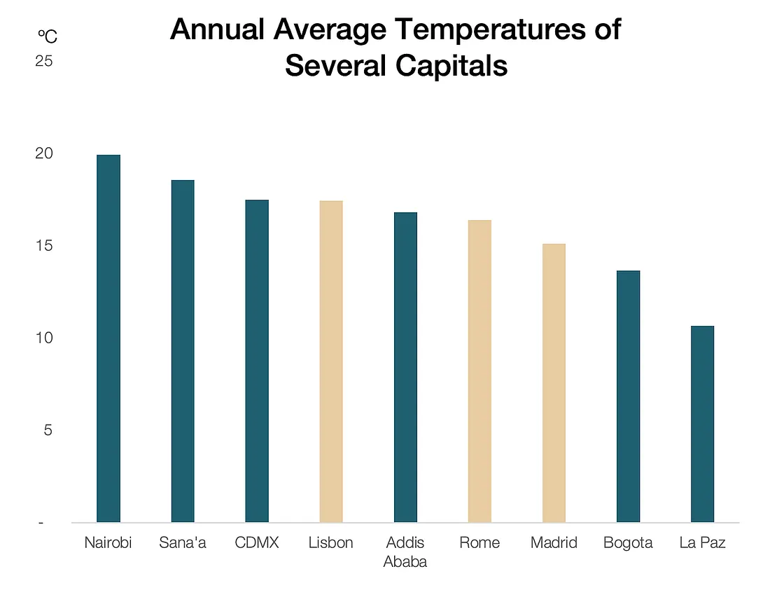 Середня температура у багатьох столицях бідних країн або країн із середнім рівнем доходу не дуже відрізняється від температури в деяких західних країнах. Аддіс-Абеба (Ефіопія) — холодніша за Лісабон, а Богота — холодніша за Мадрид.