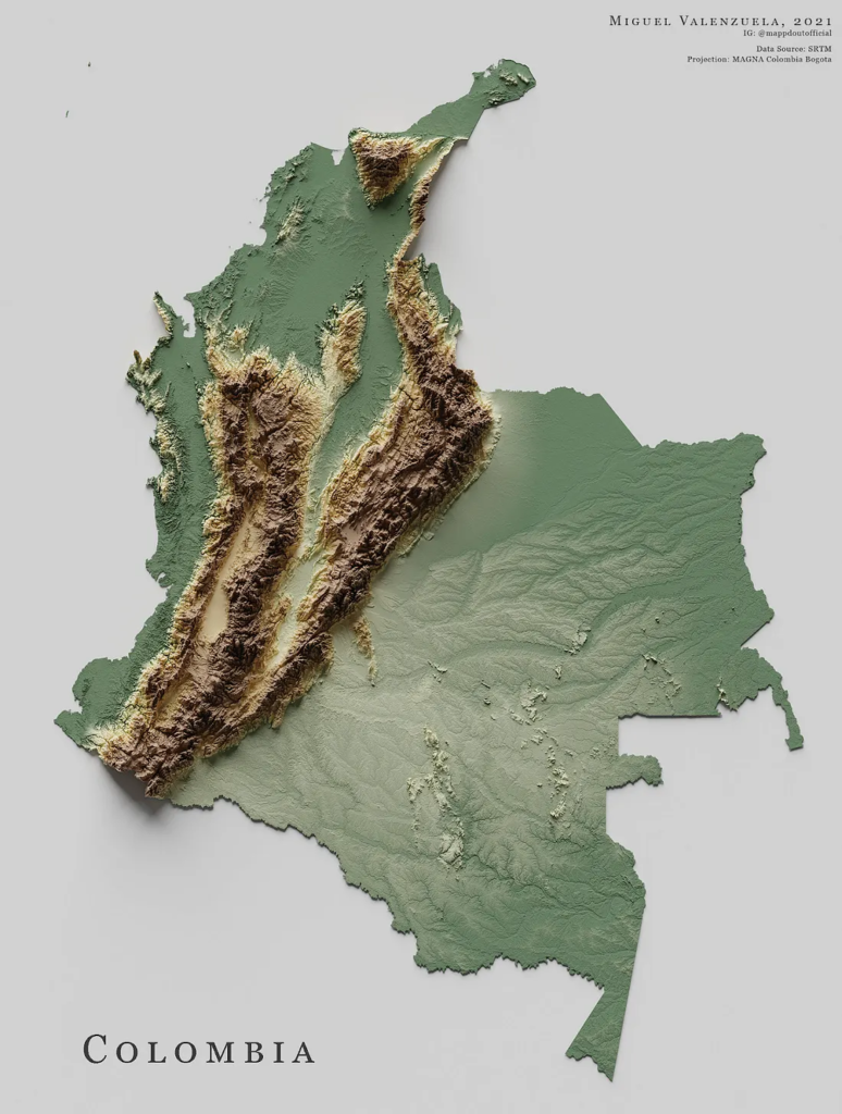 Богота була заснована у горах, далеко від моря, у 1538 році, всього через кілька десятиліть після відкриття Америки іспанцями. Колонізаторам доводилося боротися з хворобами й конфліктами на прибережних рівнинах, тому було варто подолати сотні миль углиб континенту й піднятися на тисячі метрів, аби вижити. Цей регіон значно кращий для сільського господарства, ніж прибережні рівнини, — завдяки меншій кількості хвороб і ґрунтам, які не так сильно вимиваються. Ця логіка працює й для всіх трьох головних міст Колумбії: Богота (12,7 млн осіб), Медельїн (4,4 млн) і Калі (4,2 млн) — усі розташовані в горах.