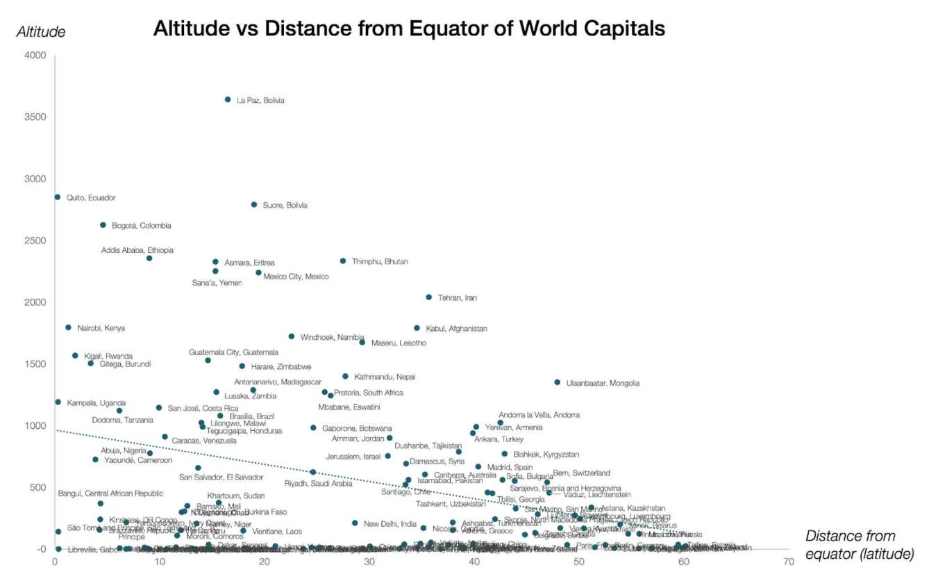 Але якщо подивитися на висоту над рівнем моря та відстань від екватора столиць світу, то чітко простежується закономірність: