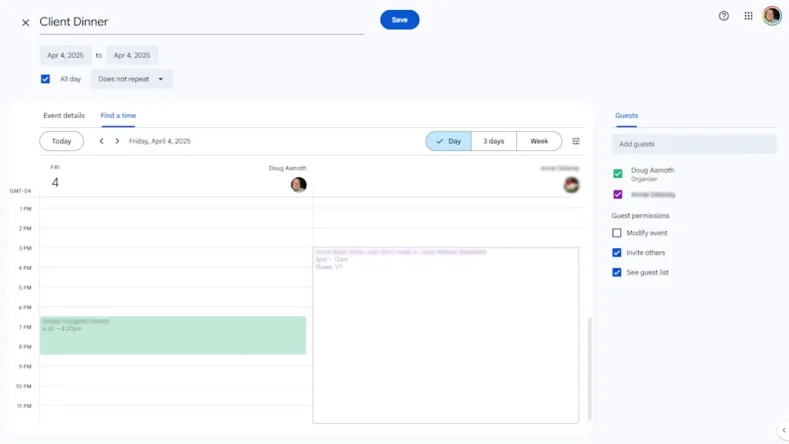 Під час створення події натисніть вкладку «Знайти час» — і календар покаже, коли запрошені колеги вільні.