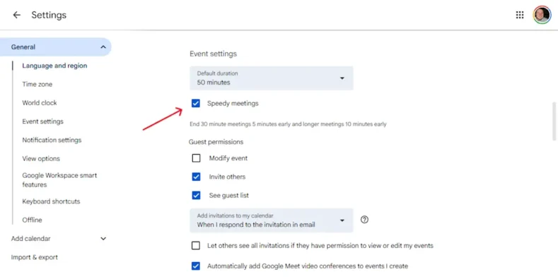 У налаштуваннях сервісу перейдіть до «Загальні» → «Налаштування події» → «Тривалість за замовчуванням» і активуйте опцію «Прискорити зустрічі».