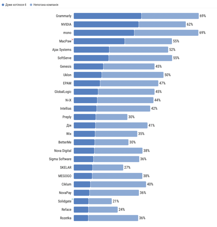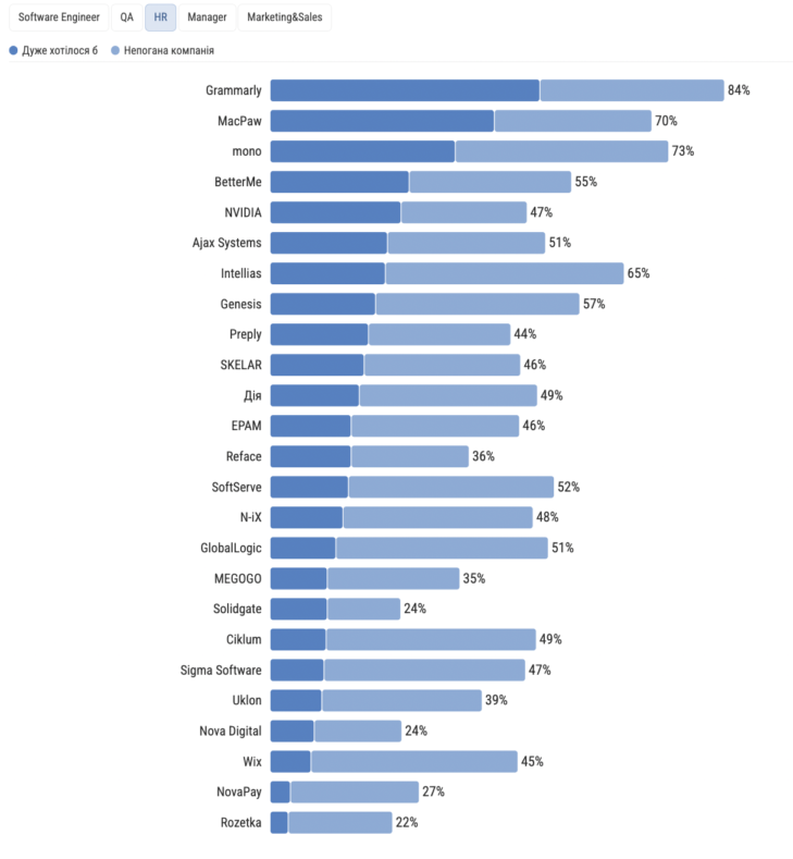 Фахівці з HR, Marketing і Sales значно частіше обирають продуктові компанії. Серед найбажаніших місць роботи вони називають Grammarly, MacPaw, BetterMe, Preply, SKELAR, «Дію», Reface та Solidgate.