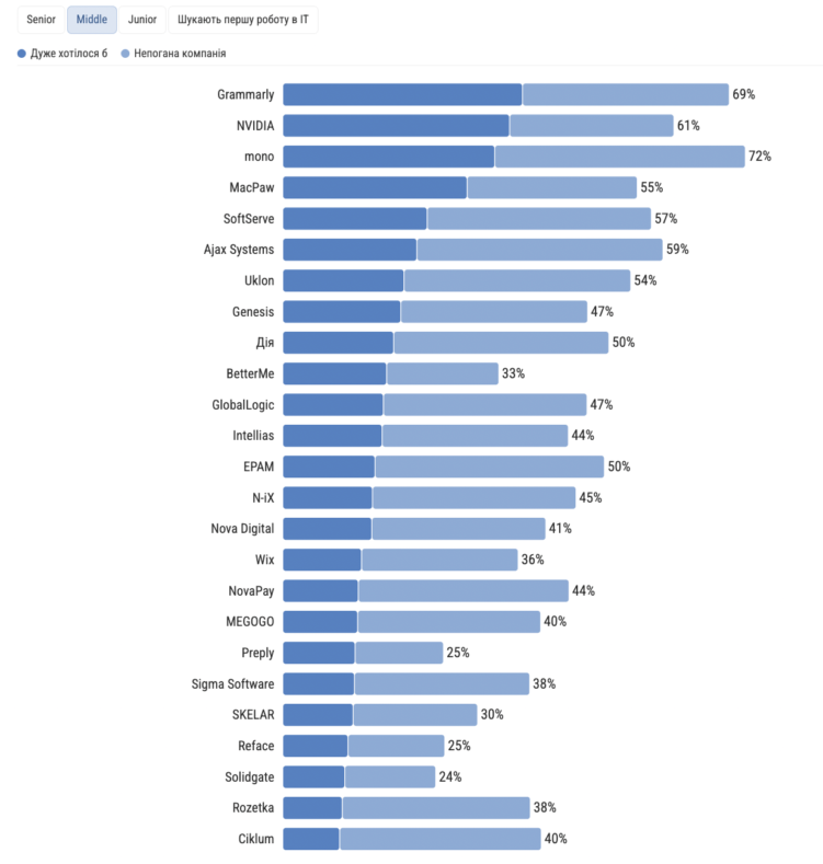 Middle-фахівці демонструють більшу прихильність до продуктових компаній. Серед найпривабливіших для них — Uklon, «Дія», BetterMe, NovaPay та Reface.