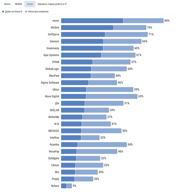 Junior-фахівці та ті, хто шукає першу роботу в ІТ, зацікавлені майже у всіх компаніях з рейтингу — як продуктових, так і сервісних. До п’ятірки найбажаніших роботодавців у цій групі, окрім mono, NVIDIA та Grammarly, також увійшли SoftServe і Genesis.