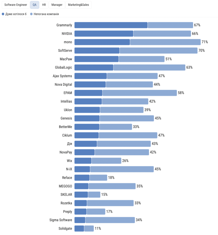 QA-фахівці частіше за інші спеціалізації орієнтуються на сервісні компанії — зокрема SoftServe, GlobalLogic, Intellias і Ciklum. Серед продуктових компаній вони найчастіше відзначають Nova Digital.