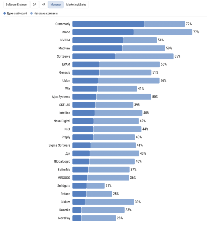 Marketing і Sales-спеціалісти дещо частіше відзначають Genesis і MEGOGO, а також сервісні компанії N-iX і Sigma Software.