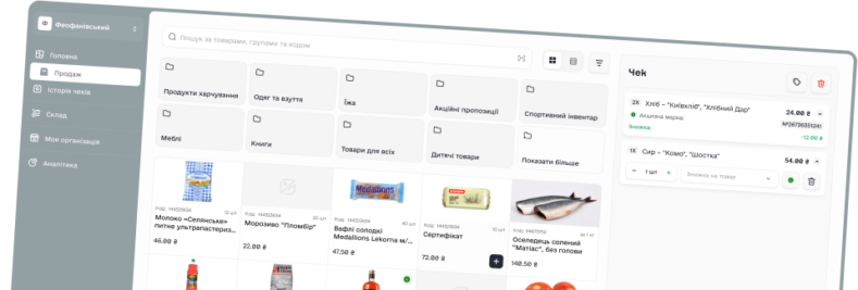 Робоче місце касира — швидка робота на смартфоні, планшеті або компʼютері з пошуком товарів за кодом, назвою чи категорією.