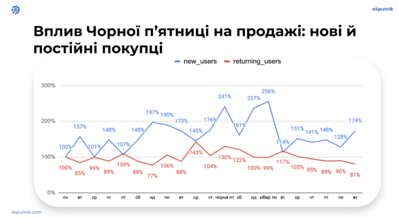 Водночас активність постійних клієнтів залишається стабільною, а повторні покупки мають пікове зростання у середу перед Чорною пʼятницею (ЧП) (+43%) та у сам день акції (+30%).