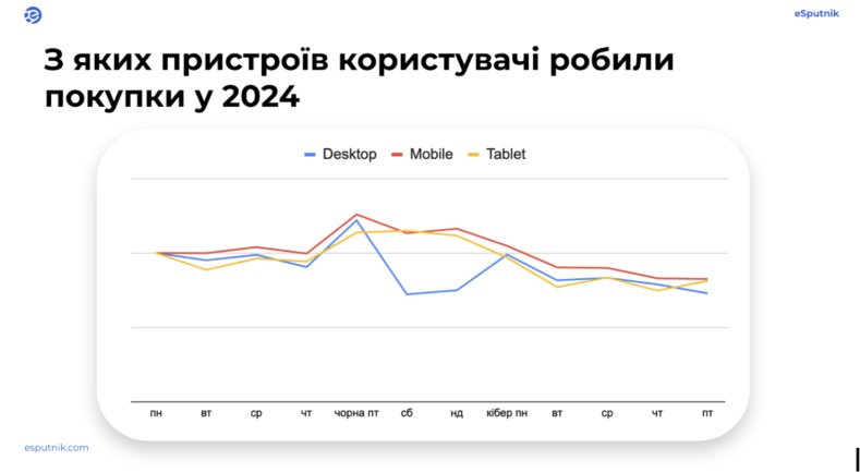 Модель поведінки покупців залишається сталою: 75% замовлень роблять зі смартфонів. У день Чорної пʼятниці показник знижується до 72%, але вже до понеділка повертається до 79%.