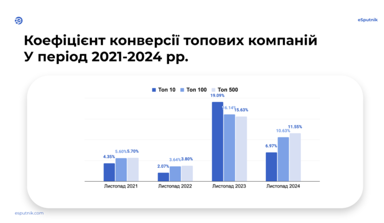 У топ-500 середня конверсія піднялася з 3,8% до 15,63%, а у 2024 році стабілізувалася біля 11,5%.