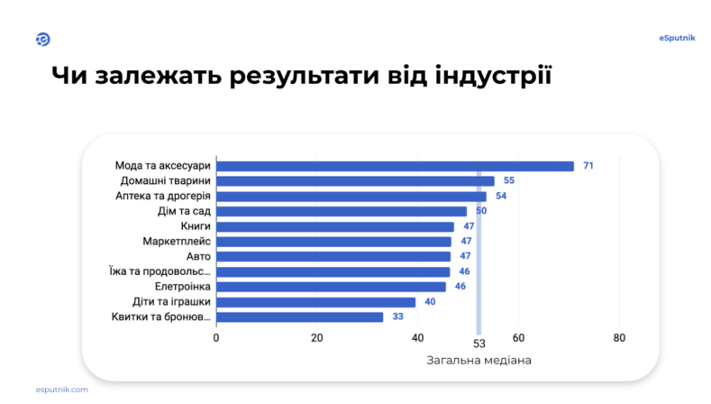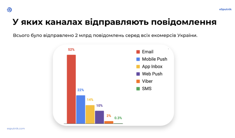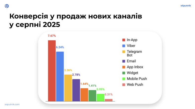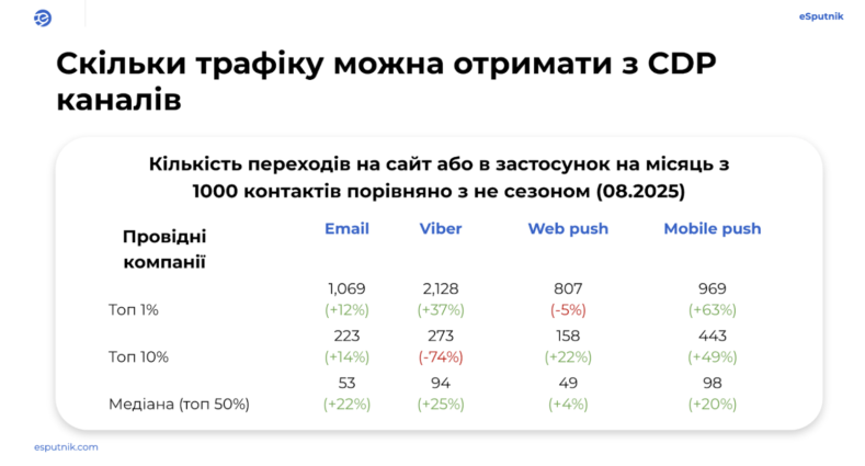 Середній показник: email +22%, Viber +25%, web push +4%, mobile push +20%.