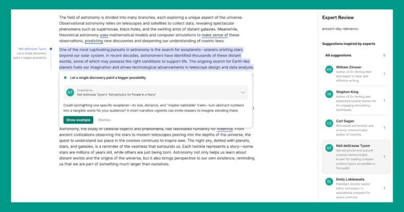 Сервіс для перевірки текстів Superhuman (ex-Grammarly) запустив нову функцію «експертного огляду», яка дозволяє отримувати зворотний зв’язок від штучного інтелекту, стилізованого під відомих письменників і науковців. Серед них — як сучасні автори, так і давно мертві.