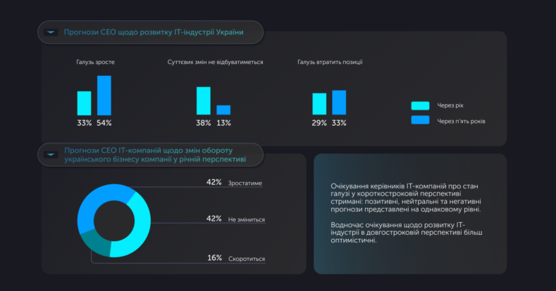 42% керівників прогнозують збільшення обороту бізнесу, ще 42% не очікують змін, а 16% припускають скорочення. Аналітики відзначають, що глобальний попит на ІТ-послуги продовжує зростати, особливо у сферах AI, data engineering, cloud та GenAI-моделей, що створює нові можливості для українського експорту.