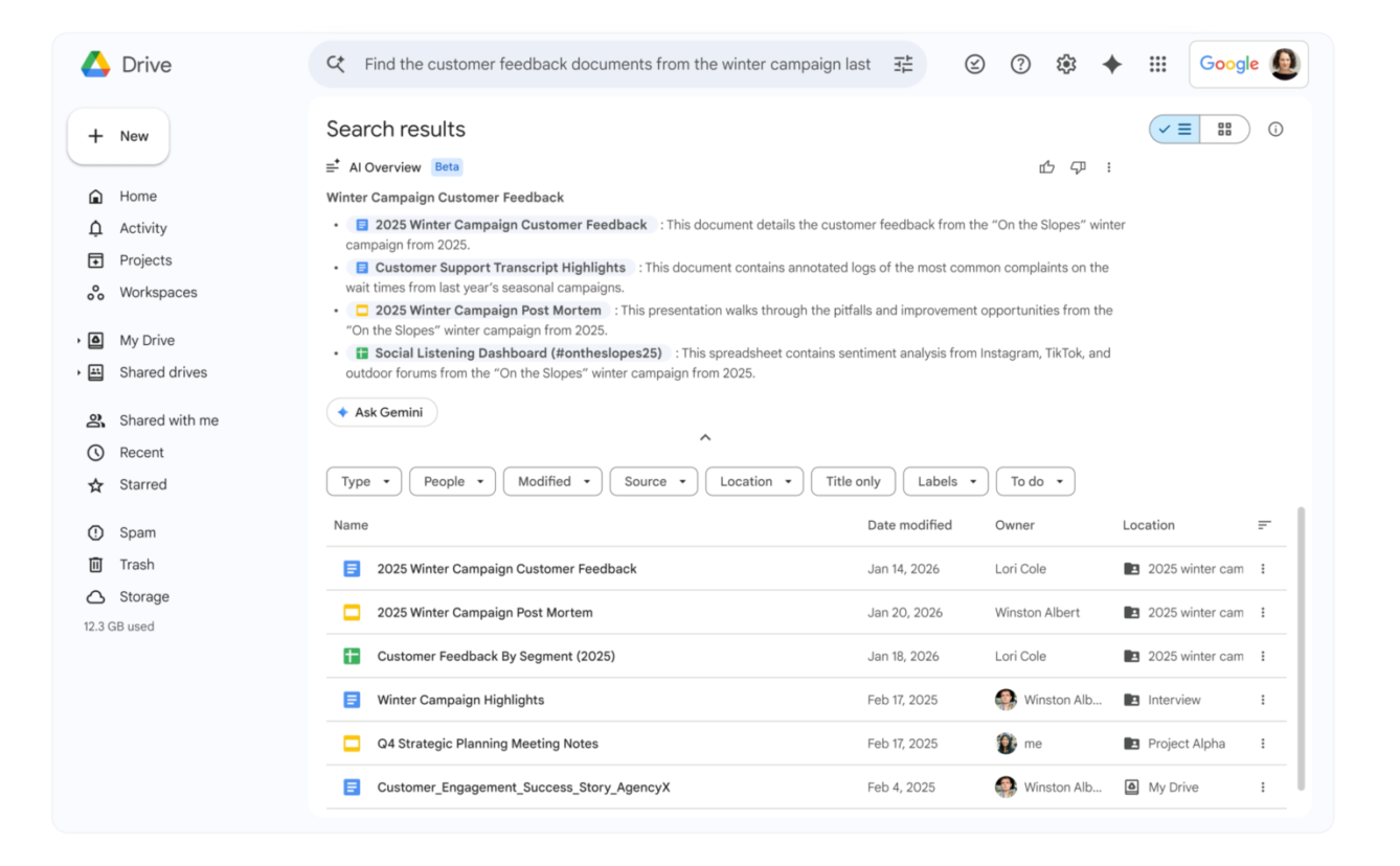 У Drive Gemini з’являтиметься у вигляді AI-огляду в результатах пошуку, підсумовуючи інформацію з файлів і посилаючись на джерела. Також нова функція Ask Gemini in Drive дозволяє ставити складні запитання щодо документів, листів, календаря та даних із мережі.