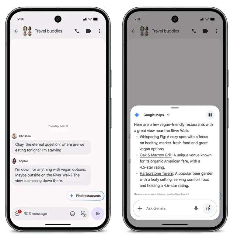 Коли ви обговорюєте з друзями, куди піти поїсти, функція Magic Cue може запропонувати скористатися Gemini. Одним дотиком відкривається вікно з варіантами ресторанів на основі вашої розмови. Перемикатися між застосунками не потрібно — усе відбувається в межах чату.