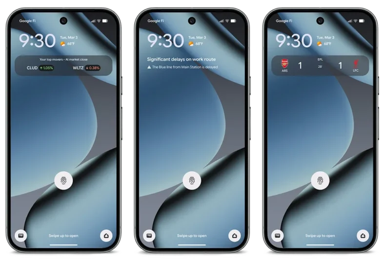 At A Glance показує важливі оновлення без зайвих дій: затримки транспорту, рахунки спортивних матчів у реальному часі, зміни у фінансовому портфелі через Google Finance або оптимальний маршрут додому.