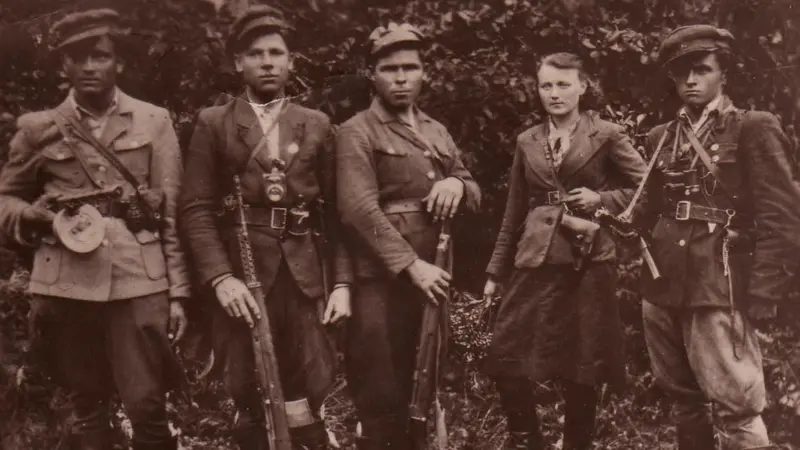 Журналістка Vector Дарія Прудіус у червоно-чорному прапорі співає «Зродились ми..» та досліджує, хто насправді платив за зброю, конспіративні квартири, друкарні та підпільну армію з 20 000 бійців нашим повстанцям.