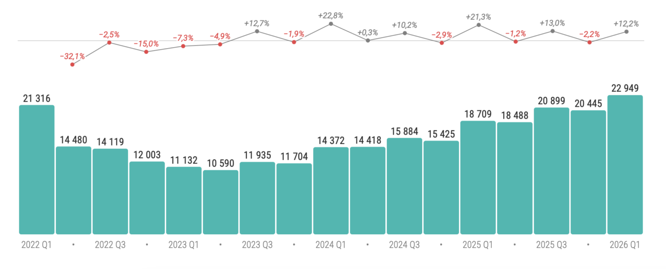 У першому кварталі 2026 року український IT-ринок показує ознаки стабілізації після спаду попередніх років. У березні цього року кількість опублікованих вакансій становить майже 8000, востаннє вищий показник був лише в січні 2022 року.
