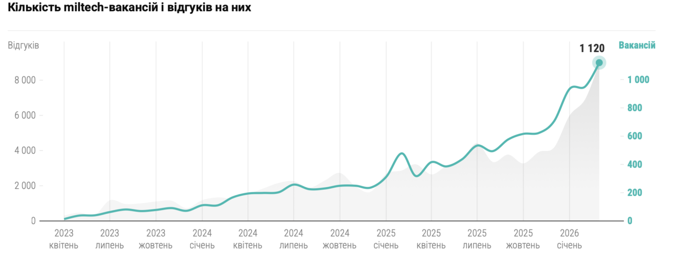 У цьому кварталі у deftech / miltech близько 1120 вакансій, що майже у 3,5 рази більше, ніж минулого року. Крім того, кількість відгуків на такі вакансії теж зростають, на одну — близько восьми відгуків.