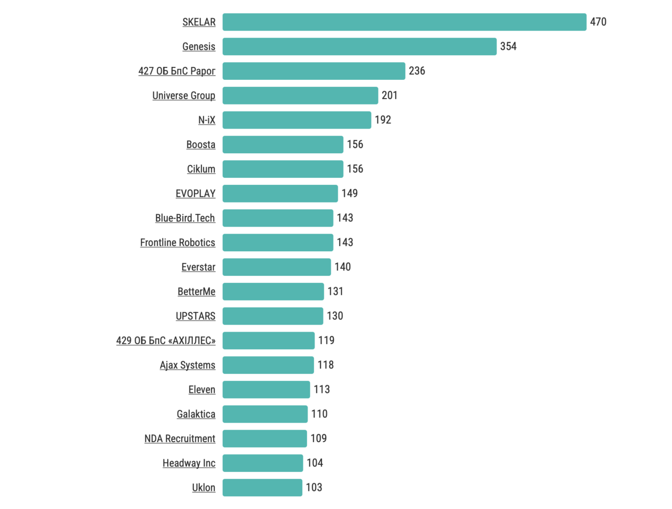 Серед 20 компаній, що найактивніше публікують вакансії. сім пов’язані з deftech або Силами оборони. Серед таких компаній: Blue-Bird.Tech, Frontline Robotics, Everstar, Eleven.