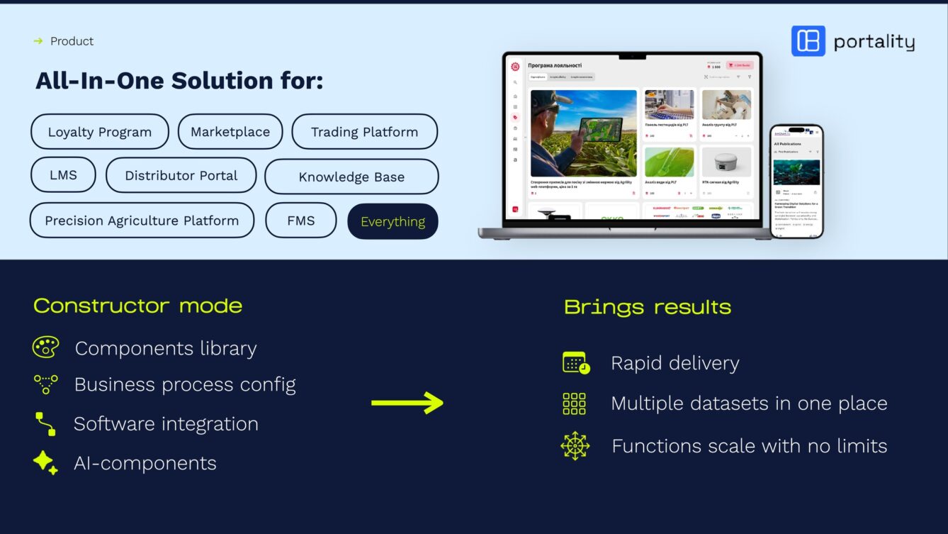 Portality — конструктор B2B-порталів для різних індустрій, що дозволяє компаніям запустити повноцінний продукт від кількох тижнів та мати необмежений набір можливостей в його масштабуванні.