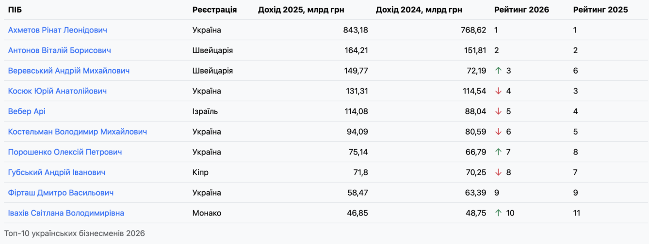 Сервіс «Опендатабот» опублікував рейтинг бізнесменів України станом на 2026 рік. Розповідаємо деталі.