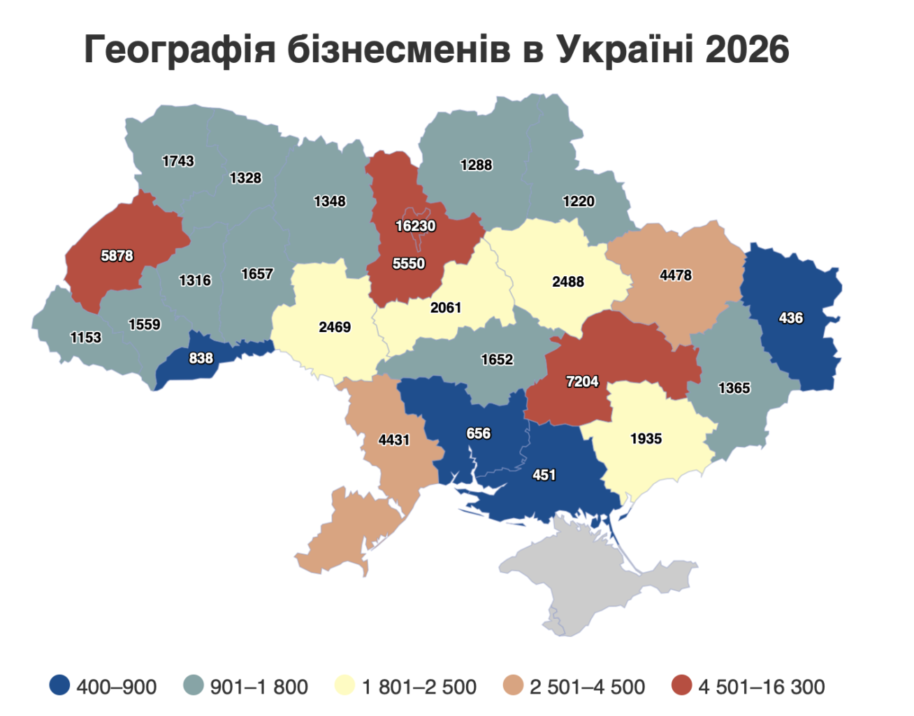 Близько 40% усього великого бізнесу країни зосереджено у трьох регіонах. Йдеться про Київ (16 230), Дніпропетровщину (7 204) та Львівщину (5 878), де зареєстровано майже чверть бізнесменів.
