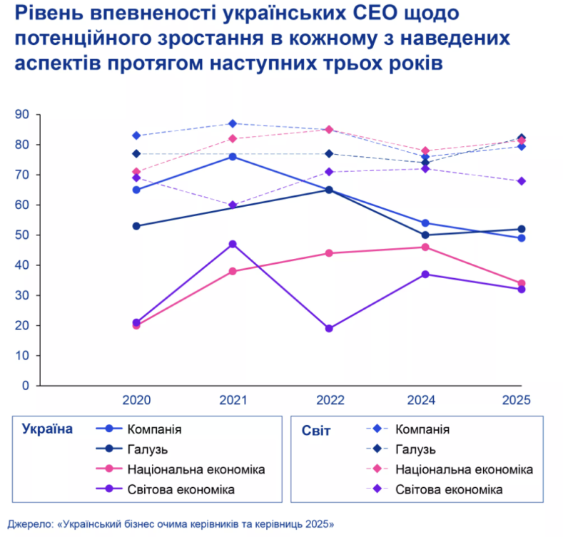 KPMG в Україні оприлюднила національні результати щорічного дослідження «Український бізнес очима керівників та керівниць 2025». Опитування проводили у серпні-жовтні 2025-го року серед 92 керівників та керівниць українських компаній з різних галузей економіки, зокрема технологічного сектора, промислового виробництва та споживчого бізнесу. Анкета складалася з 34 запитань і була адаптована з глобального дослідження KPMG 2025 CEO Outlook із додатковим локальним блоком про роль бізнесу у відновленні України.
