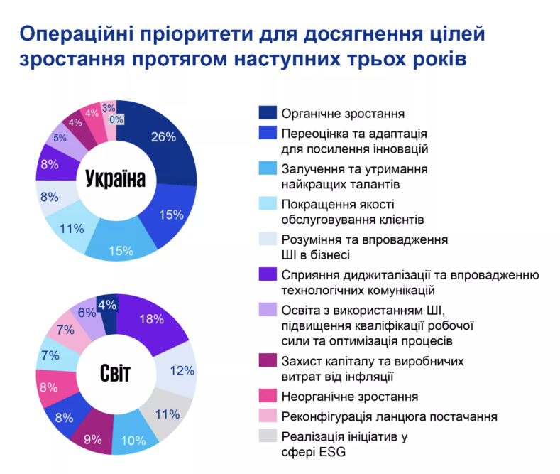 Згідно з дослідженням, майже половина українських CEO планують створювати нові продукти та сервіси для участі у відновленні країни, а також залучати іноземних партнерів і капітал. Ключовими умовами для інвестицій бізнес називає прозору правову систему, гарантії безпеки капіталу та страхування воєнних ризиків.