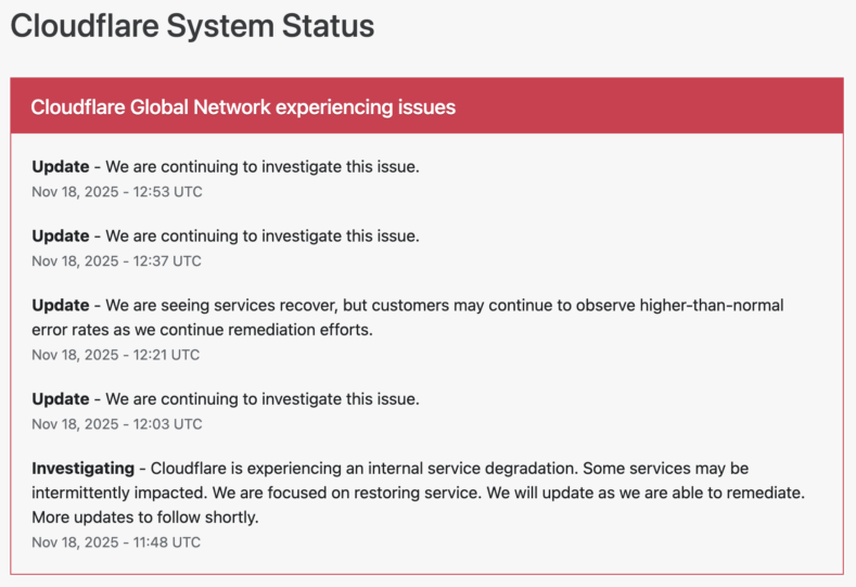Сьогодні, 18 листопада, у роботі сервісів та сайтів стався масштабний збій через проблеми з інфраструктурою Cloudflare — одного з найбільших у світі провайдерів CDN та хмарної безпеки. Перебої зафіксували у: