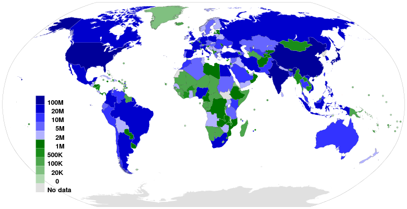 Мапа світових користувачів, які мали доступ до інтернету у 2012 році. Джерело: Dazeinfo