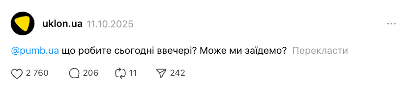 Після того як PUMB нам натякнув, наступний крок був за нами і ми наважились пофліртувати у відповідь. Ми написали окремий пост і запитали, що PUMB робитиме сьогодні ввечері — мовляв, чи можемо ми заїхати. Було цікаво подивитись на їхню реакцію, бо все це звучало як справжнє побачення між брендами.