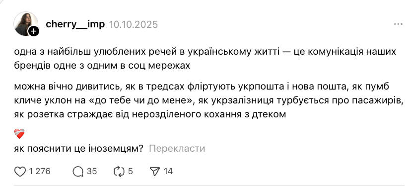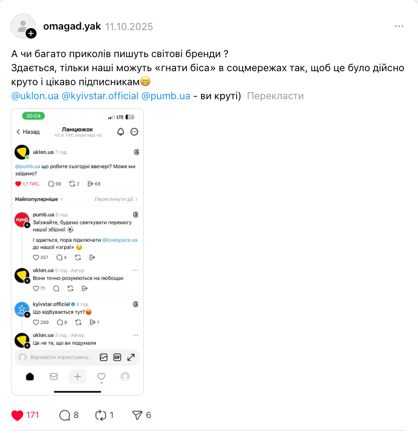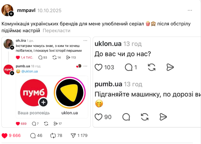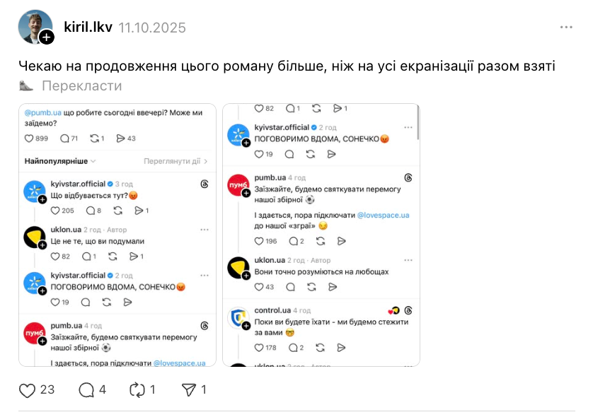 І нарешті — бренди не конкурують, коли говорять людською мовою. Навпаки, взаємодія між компаніями створює більше шуму, ніж будь-який монолог. Це не боротьба за увагу — це спільна гра, де виграють усі.