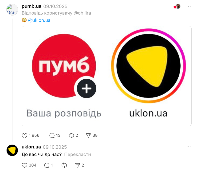 Це нагадало нам приклад «Укрпошти» та «Нової пошти», які давно майстерно жартують одна з одною у соцмережах. У свідомості людей ці дві компанії — прямі конкуренти. Коли вони починають підколювати одна одну, це створює цікаву напругу. Такі взаємодії не лише підсилюють впізнаваність бренду, а й створюють відчуття живого діалогу, який приваблює користувачів і збирає значні охоплення для обох. Ми теж давно хотіли таких стосунків, щоб між брендами виник контекст, спільний сюжет, зрозумілий аудиторії. І ось, цього разу все зійшлося: з PUMB у нас закрутилося буквально за один вечір.